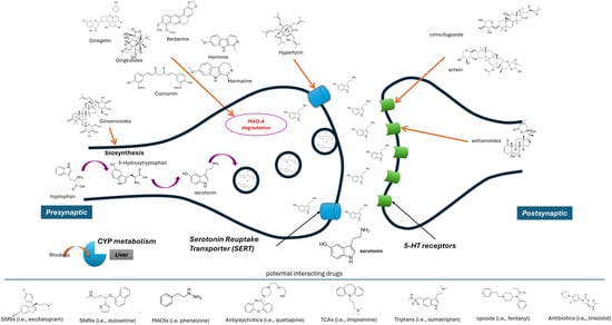 Schematic representation of serotonergic neurotransmission, highlighting the underlying mechanisms involved in serotonin syndrome. The diagram illustrates serotonin biosynthesis and release, reuptake via the serotonin transporter (SERT), postsynaptic serotonin receptors (5-HT receptors), and potential herbal compounds implicated in serotonin modulation along with potential interacting drugs. Exception is Rhodiola which its potential DHIs are related to PK-mechanisms and modulation of Cytochrome P450 (CYP).