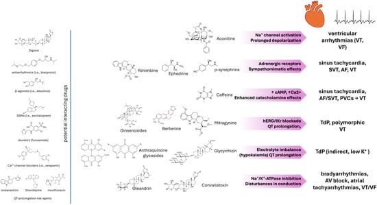 Cardiac arrhythmias, including QT prolongation, torsade de pointes (TdP), and ventricular tachycardia, may result from drug-induced disturbances in cardiac electrophysiology [97]. The most well-established mechanism involves blockade of the rapid component of the delayed rectifier potassium current (I_Kr), encoded by the human Ether-à-go-go-Related Gene (hERG). Inhibition of hERG channels delays repolarization and prolongs action potential duration, thereby increasing the risk of arrhythmogenic afterdepolarizations [98]. Additional mechanisms include myocardial heterogeneity, drug interactions, genetic polymorphisms, electrolyte disturbances, modulation of potassium (K+), sodium (Na+), or calcium (Ca2+) channels, interference with sympathetic tone, and the influence of aging or comorbidities [99,100]. When herbal constituents act synergistically or antagonistically with drugs affecting cardiac repolarization, the risk of life-threatening arrhythmias can be significantly increased [101]. Drug-induced arrhythmias are a recognized clinical challenge, precipitated by a wide range of pharmacological agents [97]. These disturbances—ranging from QT interval prolongation and TdP to bradyarrhythmias and atrial fibrillation—result from altered ion channel function, imbalances in calcium handling, or autonomic dysregulation [99,102]. Established risk factors include older age, female sex, structural heart disease, electrolyte abnormalities, genetic predisposition, and comorbid conditions such as cancer, all of which heighten susceptibility to arrhythmogenic triggers [103,104]. While antiarrhythmics, antimicrobials, psychotropics, and certain analgesics are frequently implicated, herbal supplements have also emerged as potential contributors, either independently or through interactions with prescribed medicines [101,105,106].