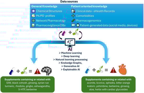 - Spanakis, M.; Tzamali, E.; Tzedakis, G.; Koumpouzi, C.; Pediaditis, M.; Tsatsakis, A.; Sakkalis, V. Artificial Intelligence Models and Tools for the Assessment of Drug–Herb Interactions. Pharmaceuticals 2025, 18, 282. [Google Scholar] [CrossRef] [PubMed]