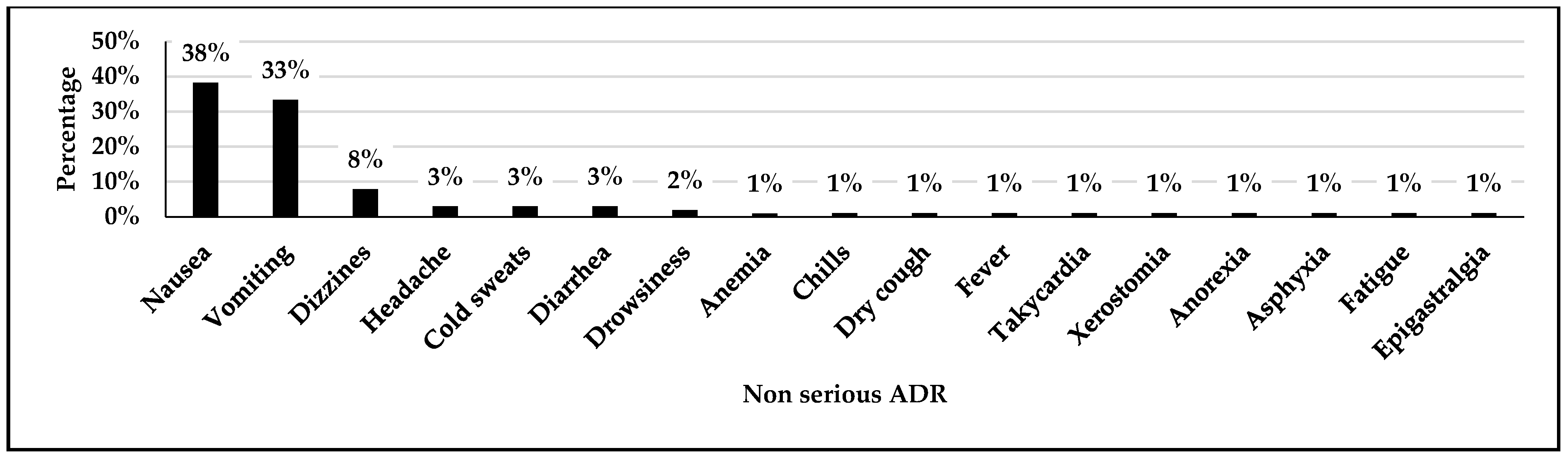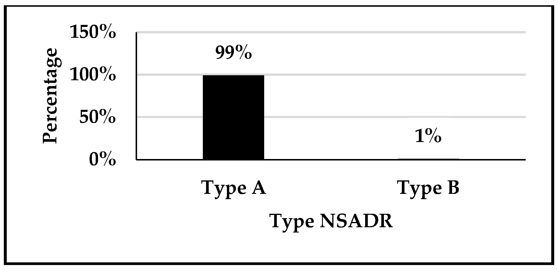 2.11. Distribution of ADRs According to Therapeutic Classes, Affected Systems, and Their Nature