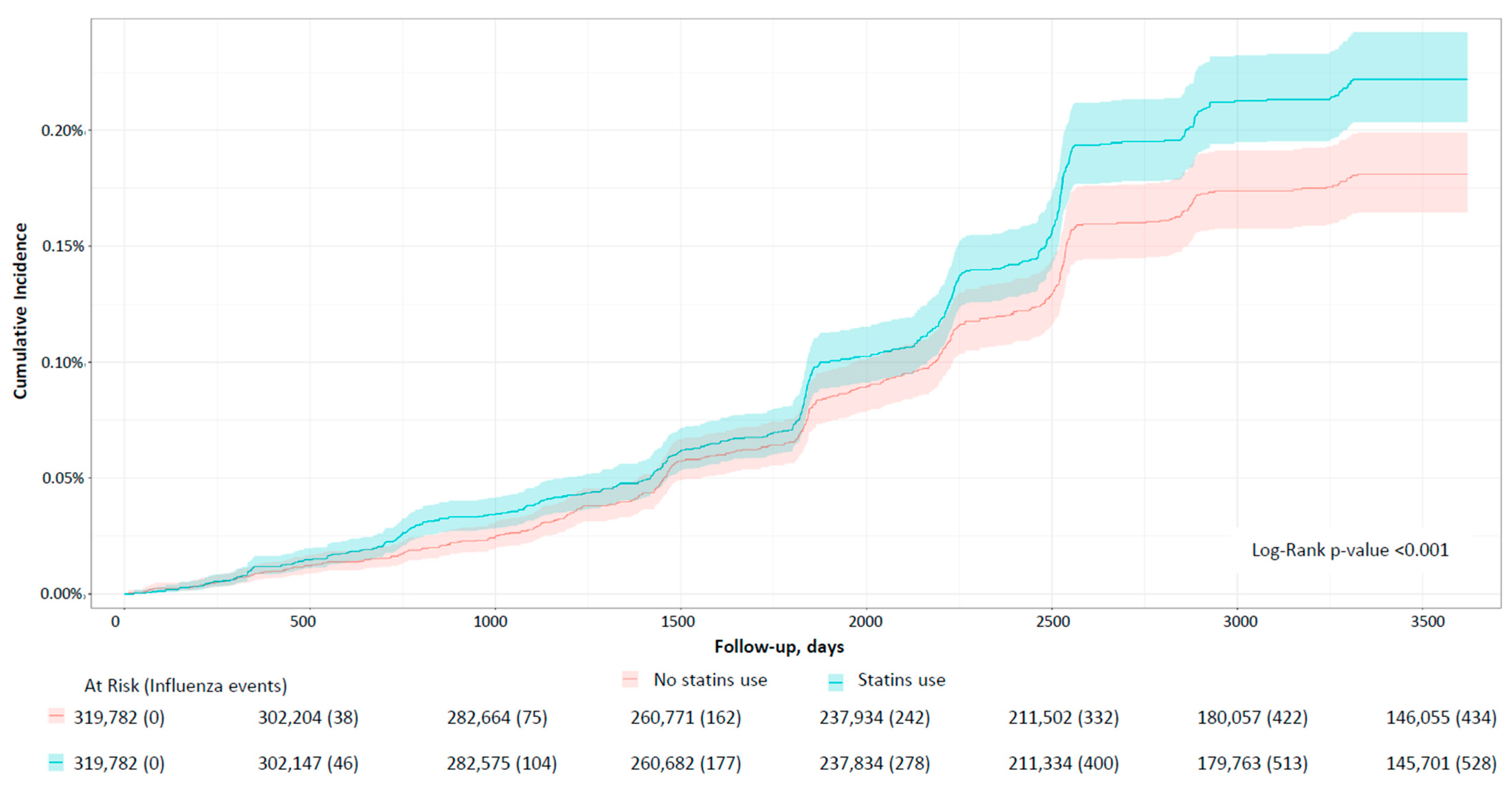 - Chiu, H.-T.; Shen, L.-J.; Chen, Y.-C.; Lin, J.-H.; Wang, C.-C. Effect of Statin Use on the Risk of Medically Attended Acute Respiratory Illness among Influenza Vaccinated Elderly. Vaccine 2018, 36, 6133–6137. [Google Scholar] [CrossRef]