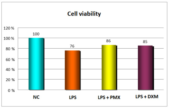 Percentage of cell viability in the different study groups: phosphate-buffered saline (PBS), negative control (NC); lipopolysaccharide from E. coli (LPS), positive inflammatory control; LPS plus PMX, test sample; and LPS plus dexamethasone (DXM), positive anti-inflammatory control. See number of runs in Table 1.