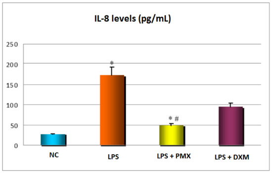 The results obtained in the levels of IL-8 in the different test conditions are shown in Table 1. The lowest level of IL-8 (mean ± SEM) was 48.7 ± 5.1 pg/mL and was observed in the LPS plus PMX test condition.