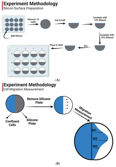 (A) Experiment methodology for silicon surface preparation. (B) Cell migration protocol summary (M1, M2, and M3 are the three measurements used for the analysis).