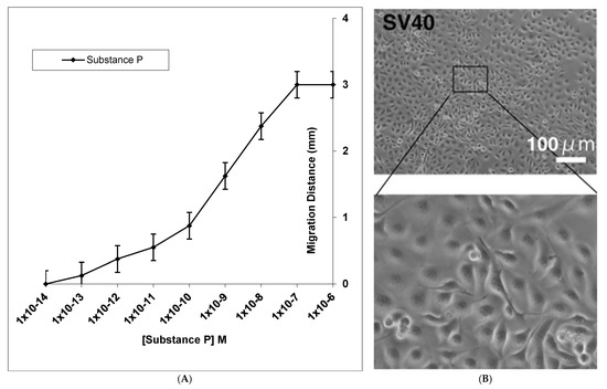 (A) The effect of SP on cellular migration of SV-40 Cells. SV-40 cells were treated with various concentrations of SP in DMEM-F12-free serum media. Error bars represent the SEM from three determinations. (B) Cell morphology of SV-40 cells [24]. The measurements were taken after 7 days.