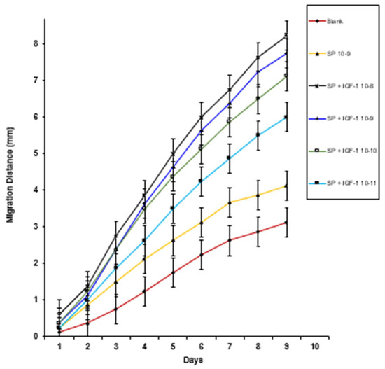 It was found that SP alone would stimulate migration with a half-maximal concentration of 10−9 M (Figure 2). The effect of SP alone and then in the presence of different concentrations of IGF-1 (10−10 M) or insulin (10−10 M) was determined at different times (days) (Figure 3 and Figure 4). Day 7 was chosen to determine a dose response curve for the SP stimulation in the presence of either insulin (0.1 nM) or IGF-1 (0.1 nM), with or without the SP-specific inhibitor CP96345 (Figure 5 and Figure 6). This showed half-maximal stimulation at 10−9 M; however, the maximum stimulation was much higher than that shown by either SP, insulin, or IGF-1 alone (Figure 7 and Figure 8). IGF-1 and insulin both showed half-maximal stimulation in the presence of 10−9 M SP, at 5 × 10−11 M. The SP effect was inhibited with the NK1-specific inhibitor CP96345, which had no effect on IGF-1 or insulin stimulation of migration (Figure 9).