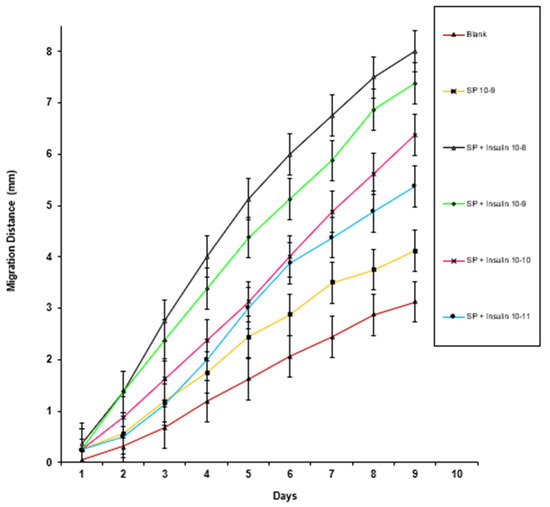 Effect of SP (1 nM) with insulin, on cellular migration of SV-40. The measurements were taken after 7 days. Error bars represent the SEM from three determinations. Significance (*) was defined as a p < 0.05 using Student’s t-test. The different number of stars represent significance * p < 0.05 and ** p < 0.01.