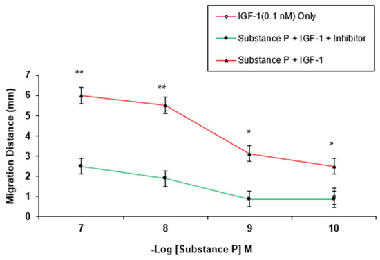 The SP-stimulated migration in the presence of IGF-1 is inhibited by the NK-1-specific inhibitor CP96345. The measurements were taken after 7 days. Error bars represent the SEM from three determinations. Significance (*) was defined as a p < 0.05 using Student’s t-test. The different number of stars represent significance * p < 0.05, ** p < 0.01.