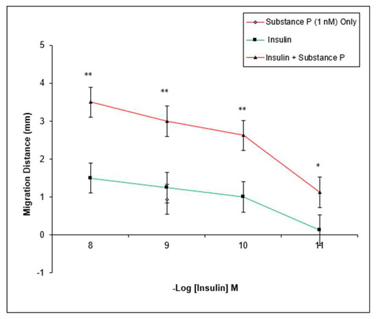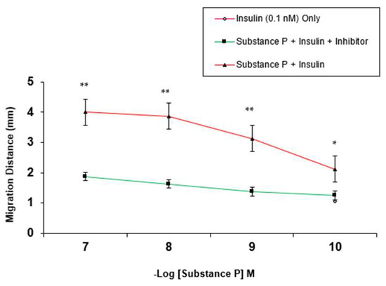 The SP-stimulated migration in the presence of insulin is inhibited by the NK-1-specific inhibitor CP96345. The measurements were taken after 7 days. Error bars represent the SEM from three determinations. Significance (*) was defined as a p < 0.05 using Student’s t-test. The different number of stars represent significance * p < 0.05, ** p < 0.01.