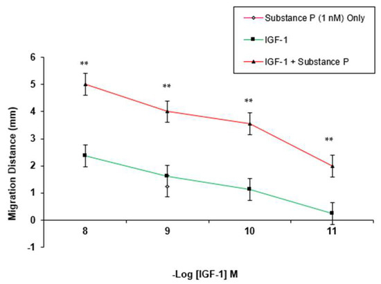 SP is synergistic with IGF-1 on cellular migration of SV-40 at 1 nM. The measurements were taken after 7 days. Error bars represent the SEM from three determinations. Significance (*) was defined as a p < 0.05 using Student’s t-test. The different number of stars represent significance ** p < 0.01.