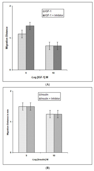 These results are shown in the Supplementary Materials. It was found that SP alone would stimulate migration (Figure S1). The effects of SP alone and then in the presence of different concentrations of IGF-1 or insulin were determined at different times (days) (Figures S2 and S3). This shows that the response is uniform for the two different growth factors over time. The dose response curves for the SP stimulation in the presence of either insulin (0.1 nM) (Figure S4) or IGF-1 (0.1 nM) (Figure S5), with or without the SP-specific inhibitor CP96345, were then determined. These showed roughly a half-maximal stimulation at 10−9 M SP. The maximum stimulation of SP with insulin or IGF-1 was much higher than that shown by either SP, insulin, or IGF-1 alone (Figures S6 and S7). Using the data from 7 days of migration IGF-1 and insulin both showed half-maximal stimulation in the presence of 10−9 M SP at 5 × 10−11 M (Figures S6 and S7). The SP effect was inhibited with the NK-1-specific inhibitor CP96345, which had no effect on IGF-1 or insulin stimulation of migration (Figures S8 and S9). It is worth noting that the results with these cells are almost identical to those using human SV40 corneal epithelial cells. Thus, using cells from a different mammalian species, which was used for almost all the early studies, gives the same results as those observed for human cells.