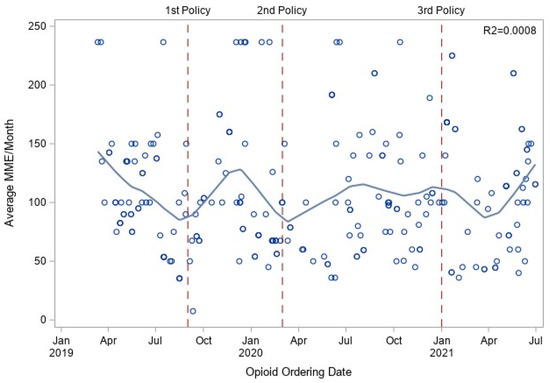 Table 1 summarizes the patient population’s demographics and surgery type as separated by time period in relation to the effective dates of the state policies. Out of the 520 patients who met the inclusion criteria, 218 (41.9%) were prescribed an opioid following oculoplastic surgery. Of these 218 patients, 90 (41.3%) were male and 128 were female (58.7%). The mean age of all 218 patients was 54.4, with a SD of 18.9 years. There were no significant differences regarding age or sex in our study population (p = 0.84). Spline linear regression analysis over time indicated no significant changes in average MMEs per month after September 2019 (95% CI: −0.1531–0.1256, p = 0.85), after March 2020, (95% CI: −0.000997–0.00093, p = 0.97), or after January 2021 (95% CI: −0.001431–0.00164, p = 0.096). The most common procedure performed was orbital-floor fracture repair (n = 131, 48.3%). This procedure also represented the highest MMEs prescribed per month (140.5, SD = 81.0). Statistical significance was reached for differences in MMEs/month prescribed per time period for entropion repair (n = 4, p = 0.04) and dacryocystorhinostomy (n = 17, p = 0.04). However, despite reaching significance, these procedure types had small sample sizes. Finally, although dacryocystorhinostomy only comprised 6.3% of the total procedures included, it contributed a high total mean MMEs/month (91, SD = 39.3).