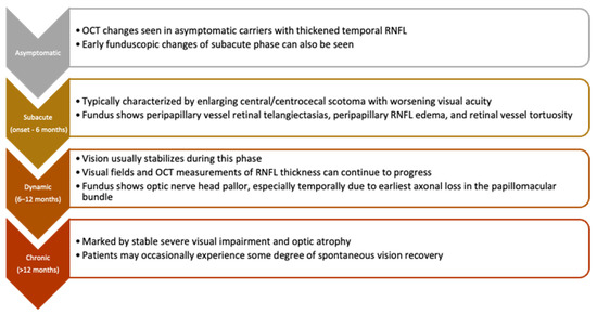 After initial vision loss, LHON has been described as having three stages: subacute, dynamic, and chronic [26]. Figure 1 details the classic characteristics seen in each stage. Asymptomatic carriers can also demonstrate optical coherence tomography (OCT) and fundus changes without evidence of accompanying visual loss [20]. Visual acuities classically plateau around 4 months, with nadir worse than 20/200 (or 6/60) [19]. For patients with initial unilateral onset, bilateral involvement commonly occurs by the end of the subacute stage since the second eye manifests symptoms on average in about 2–3 months. Vision usually stabilizes in the dynamic phase although prior fundus exam changes regress and optic nerve head pallor becomes prominent, especially temporally due to earliest axonal loss in the papillomacular bundle (PMB) [20]. Visual fields and OCT measurements of retinal nerve fiber layer (RNFL) thickness also continue to progress [26]. The chronic phase, occurring after 12 months, is marked by stable severe visual impairment and optic atrophy. Occasionally, patients may experience some degree of spontaneous vision recovery. A more favorable course has been associated with the m.14484T>C variant, though recovery is often incomplete [27].