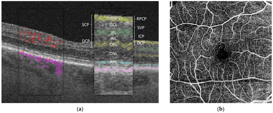 - Campbell, J.P.; Zhang, M.; Hwang, T.S.; Bailey, S.T.; Wilson, D.J.; Jia, Y.; Huang, D. Detailed Vascular Anatomy of the Human Retina by Projection-Resolved Optical Coherence Tomography Angiography. Sci. Rep. 2017, 7, 42201. [Google Scholar] [CrossRef]