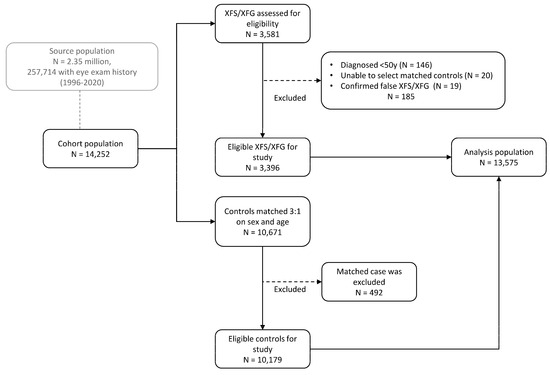We identified 3405 patients diagnosed with XFS or XFG during a dilated eye exam within the UHealth system from 1996 to 2021 based on one or more International Classification of Diseases (ICD) diagnostic codes (versions 9 and 10): 365.52, 366.11 (ICD-9); H40.14, H25.89 (ICD-10). In addition, 176 patients without the preceding codes, but with an open-angle glaucoma diagnosis of 365.1 (ICD-9) or H40.10–H40.13, H40.15 (ICD-10), who also had a text string indicating exfoliation (e.g., pseudoexfoliation, PXE, exfoliation, XFG) and an XFS/XFG diagnosis by chart review, were identified. In total, 3581 case patients were assessed for study eligibility. For inclusion, a case had to be aged 50 years or older at index diagnosis and have at least one appropriate matched control. A detailed chart review was performed in a subset of 506 cases, and we found that 19 of 3415 eligible patients (<1%) did not have a clinical diagnosis of XFS/XFG, meaning they were excluded along with their matched controls. Ultimately, 3396 eligible XFS/XFG patients in Utah were identified for this study (Figure 1).