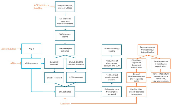 - Wilson, S.E. Two-phase mechanism in the treatment of corneal stromal fibrosis with topical losartan. Exp. Eye Res. 2024, 242, 109884. [Google Scholar] [CrossRef]