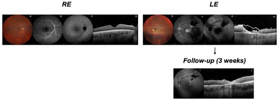 Upon initial examination, his best-corrected visual acuity (BCVA) was 20/20 in the right eye (RE) and 20/200 in the LE according to the Snellen chart. The ophthalmoscopic examination and fundus photography of the RE did not reveal any pathological alterations (Figure 1A), while the LE showed significant vitreous turbidity and a focus of chorioretinitis in the fundus (Figure 1E). We conducted a comprehensive multimodal imaging assessment, including fluorescein angiography (FA), optical coherence tomography (OCT), and indocyanine green angiography (ICGA) (Figure 1).