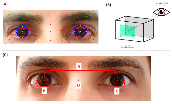 (A) Showcasing essential eye landmarks, emphasizing algorithm precision; (B) demonstrating technical calculation for camera-to-eye distance [20]; (C) spotlighting crucial landmarks within the algorithm’s input. A, pupillary distance (PD); B, white-to-white (WTW) measurement of the right eye; C, white-to-white (WTW) measurement of the left eye; D, midpoint of the nasal bridge.