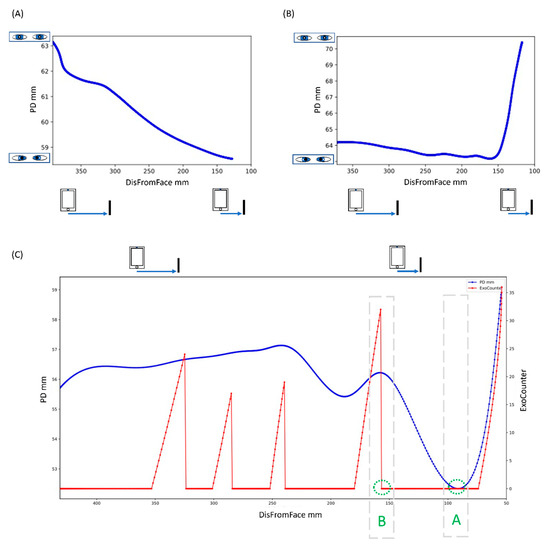(A) Shows PD variation with phone distance. The subject converges smoothly without interruption; (B) depicts CI with a clear “breaking point” around 16 cm from the face; (C) outlines NPC determination, refining PD shift, and integrating ExoCounter by phone distance. A, last local minimum of the PD; B, chosen NPC; PD, pupillary distance; DistFromFace, distance from face; ExoCounter, exodeviation episode’s counter; NPC, Near Point of Convergence.