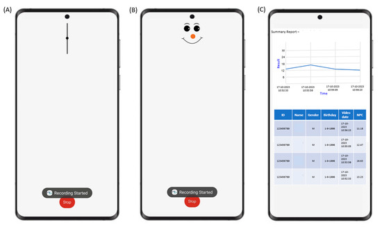 Our automatic system (MobileS) is a mobile phone application designed for Near Point of Convergence (NPC) detection. (A) shows the adult NPC test; (B) presents the child-specific NPC test; (C) The Results interface combines tabular and graphical data for clarity.