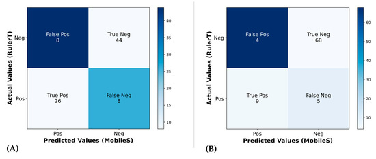 Confusion matrices comparing “MobileS” and “RulerT” for diagnosing Convergence Insufficiency (CI). (A) The 10.0 cm threshold (Normal vs. CI); (B) 13.41 cm threshold for finer CI classification.