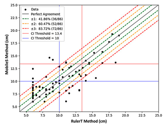 Diagnostic Capability for CI: When the diagnosis of CI is based on an NPC threshold of >10 cm, the MobileS could identify CI in 26 out of 86 participants (30.23%), demonstrating a sensitivity of 76% and a specificity of 85% (Figure 4A). When CI was based on NPC > 13.41 cm, CI was found in nine patients (10.46%), corresponding to a sensitivity of 64% and a specificity of 94% (Figure 4B). A percentage of 83.72% of the NPC values obtained through the MobileS were within ±3 cm compared to the NPC values acquired by the RulerT (Figure 5).