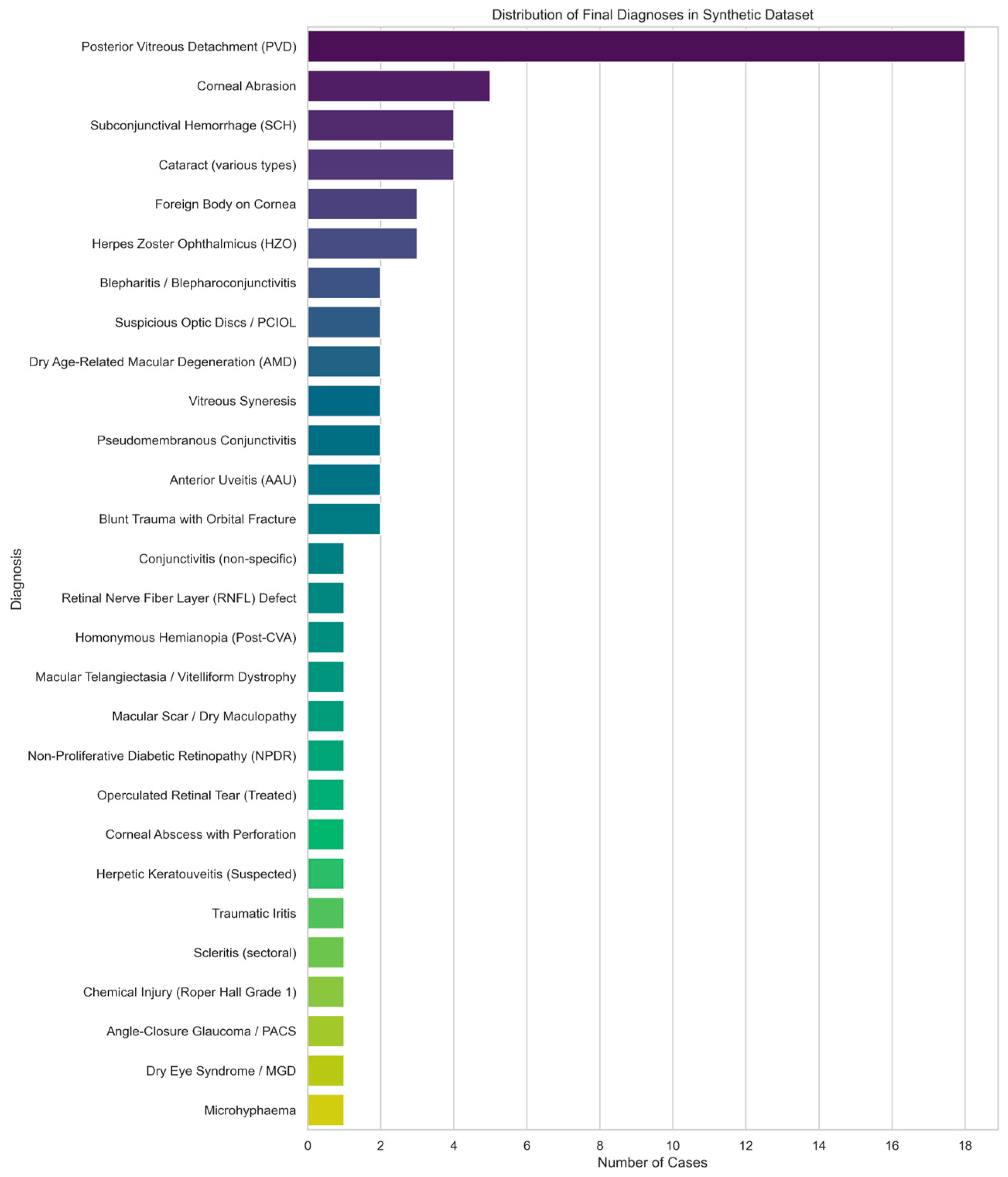 To overcome this, a synthetic dataset of 100 ophthalmic triage cases was generated based on the clinical dataset using one-shot prompting with GPT-4 to create a more comprehensive and clinically realistic dataset that would mimic information obtainable from real-world cases more closely. The outputs of the earlier data pre-processing and textual consistency pipeline were then fed into GPT-4 to generate this synthetic dataset. GPT-4 was selected for synthetic data generation due to its superior few-shot reasoning and clinical language capabilities. This approach produced high-quality cases that mirrored the linguistic and conceptual structure of authentic ophthalmic records. The diagnoses included in the dataset were selected to represent ophthalmological conditions commonly seen in the emergency and outpatient settings.