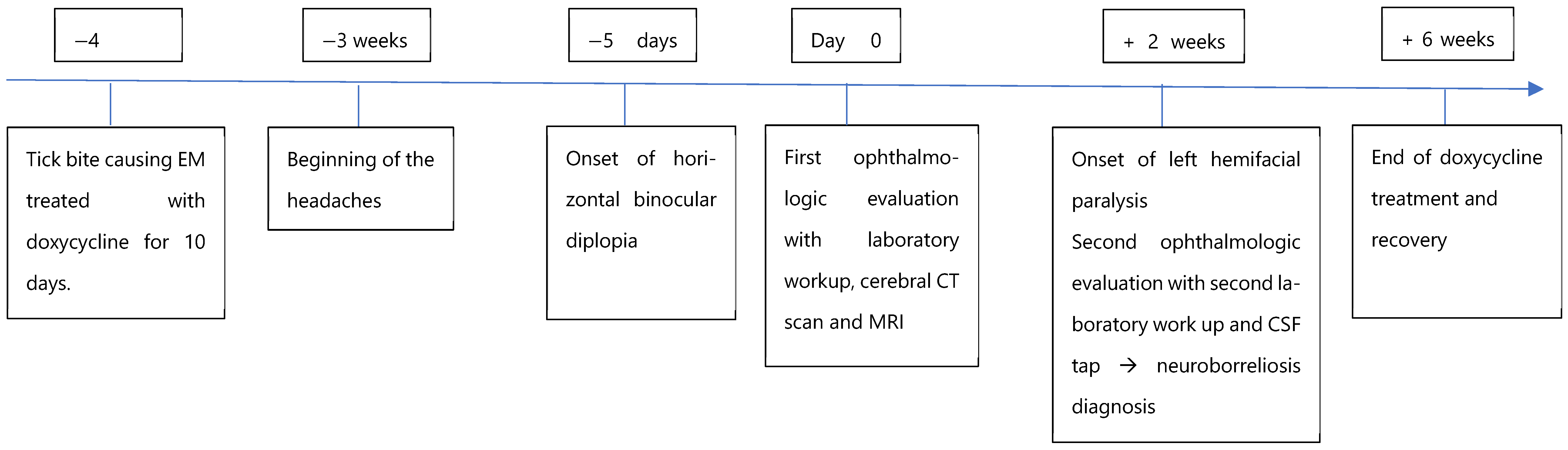 The patient’s headaches warrant careful consideration. Headache is very common, especially in young adults. In the absence of focal neurological signs or systemic symptoms, it usually does not prompt further investigation. However, in this case, the headaches could indicate early central nervous system involvement and may represent the first symptom of neuroborreliosis. They were likely caused by early neuroborreliosis-related meningitis. They may also have been partially related to gradual onset of diplopia, which can induce patient’s discomfort.