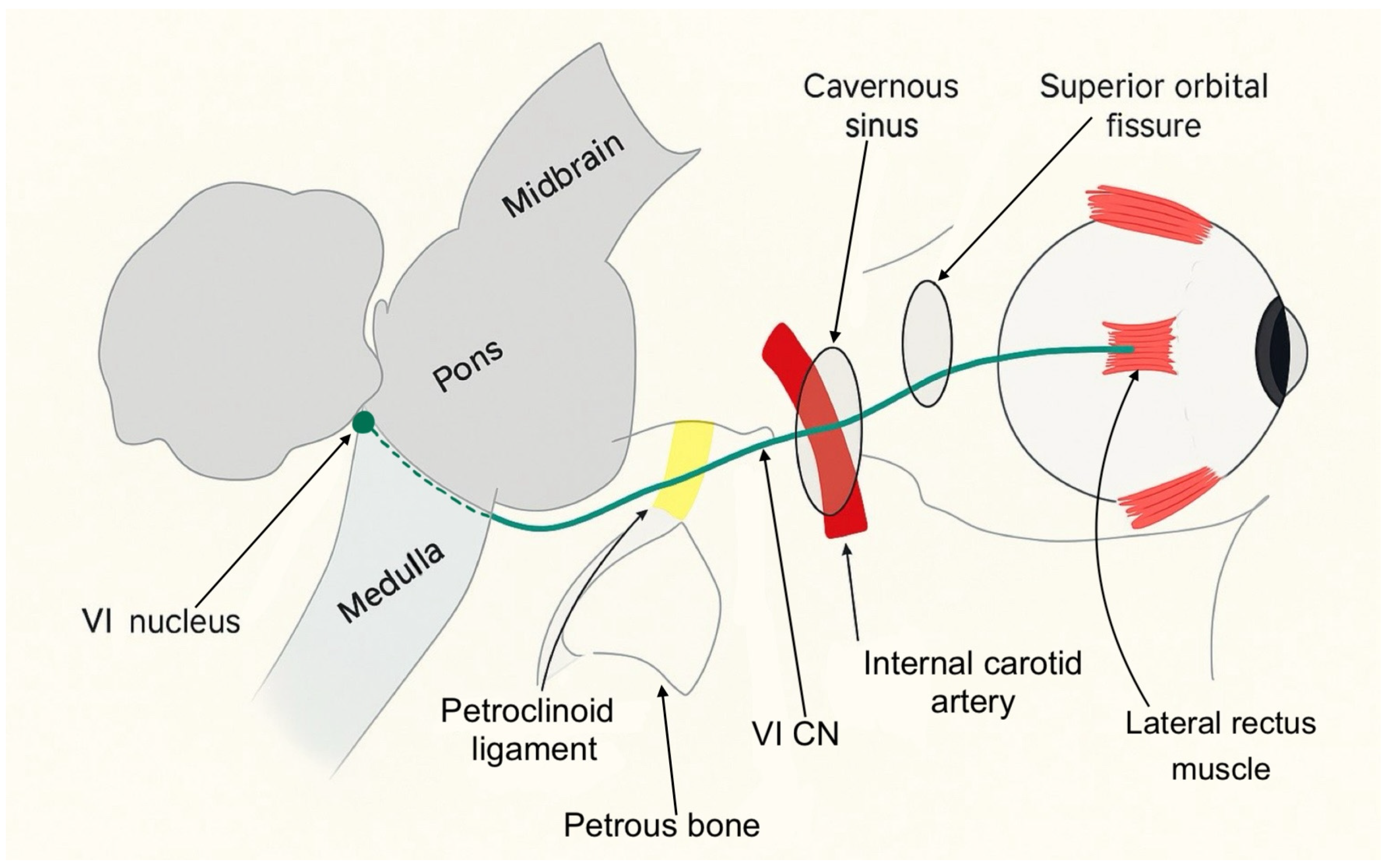 Figure 9, the sixth cranial nerve, also known as the abducens nerve, has a long course extending from the sixth nerve nucleus in the dorsal pons to the lateral rectus muscle within the orbit. Its anatomy makes it vulnerable to injury at numerous points. Sixth nerve palsies can be classified into distinct syndromes based on the anatomical location of the nerve involvement: brainstem syndrome, petrous apex syndrome, cavernous sinus syndrome, orbital syndrome, and isolated sixth nerve palsy. Each of these regions has characteristic associated signs that can help localize it.
