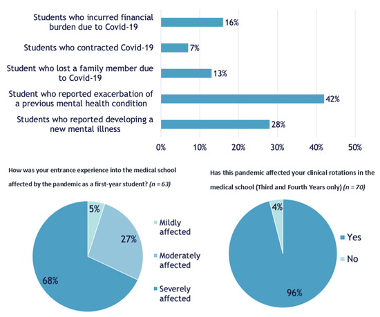 COVID-19 has affected medical education and population health since March 2020 and called for a rapid adaptation in medical education. It is essential to understand the impact of COVID-19 on medical education and students’ well-being, as these students will serve in the future medical workforce. Their experiences during this time will shape their decision as physicians and prime them for the flexibility needed in the medical field. Per the survey results, students at all levels of medical education in 2020–2021 were affected by the pandemic in multiple ways. The most substantial response was developing a new mental illness and exacerbating a previous mental health condition. The first-year students significantly impacted their medical education, as all lectures, including anatomy teaching, were moved to virtual. Second-year students, who were noted to be approaching dedicated study time for their step 1 USMLE examination, which was numerically scored in 2020, had the highest rates of mental illness, although this was not statistically significant. This effect does lead us to consider the stress of step 1 USMLE examination compounded with social isolation at that time. 96% of third and fourth-year students reported their rotations being affected. At the pandemic’s beginning, their clinical rotations were entirely on hold. During this time, students participated in virtual rotations. After a few months, they were allowed to do clinical rotations with appropriate precautions. These patient experiences are a critical part of medical education. As vaccines were available, students were permitted in limited clinical environments. Sixteen percent of medical students incurred additional financial burdens. The government responded with loan programs meant to provide relief for students affected by COVID-19. In total, 7% of students reported acquiring COVID-19 infection, and 13% reported losing a family member due to COVID-19. This fact was something many could relate to and added to the distress of students and the community alike. COVID-19 impacted the well-being of students by affecting their mental health and financial burdens. Educational experience, clinical rotations, and entrance to medical school were the aspects most affected. Government loan programs facilitated financial relief, and the impact of these should be analyzed in the future. The many variations of medical education during this time show the resilience of the medical community. The integration of virtual lectures and simulations should be analyzed for effectiveness. This pandemic forced us to use technology more than we ever have before. It changed the workforce’s lifestyle and methods of education. Although not all practices are worth keeping, this allows us to explore further how to support medical school students. The medical school dean decided to protect medical students from the personal risk of catching COVID-19 based on the needs and local pandemic situation. This step was taken as per the guidance of the Association of American Medical Colleges. Similar measures were taken in other medical schools in the United States and worldwide. In future settings of natural disasters or major educational disruptions, this study provides a starting point for where to focus resources—mental health support, financial support, and academic flexibility. Further research should look at programs supporting medical students’ mental health and their effects during the pandemic. This study fills the literature gap in documenting the holistic impact of the pandemic on medical students at a single United States institution.