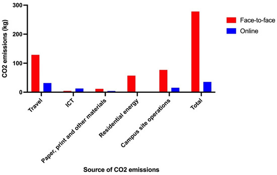 Average CO2 emissions of face-to-face and online teaching models. Results from the environmental assessment of face-to-face and online teaching model is converted to average CO2 emissions (kg) and normalised to per student per 100 study hours. Modified from: [7].