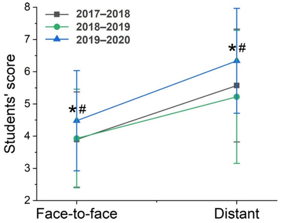 Students’ scores in the face-to-face period and in the online learning period. Data is presented for the 3 academic courses (2017/2018 and 2018/2019 being the control group and 2019/2020 the experimental group) as mean ± SD. Symbols indicate statistically significant differences (p < 0.05) between course 2019/2020 and 2017/2018 (*), 2019/2020 and 2018/2019 (#) or between the period before and after the confinement during the same course. Adapted from [6].