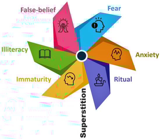 Historically, superstition has chiefly stemmed from illiteracy, immaturity, and anxiety about the unknown, usually related to the incorrect clarification of natural events (Figure 1). Superstitions could have a religious, cultural, and personal basis [8]. Of relevance, religious principles and practices may appear superstitious to a person without faith. Many communities have had an enormous and diverse array of cultural and ritual superstitions throughout history. Many cultures have held illogical views concerning ways to ward off illness, bring good fortune, predict the future, avert disease or accidents, and even choose a mate [12]. Even a medical student who does well in a professional examination may begin to think their success is due to the use of a specific pen and that the pen, therefore, is lucky; gamblers win a few times after betting on a black horse and start believing that black horses run well for them [13]. Such irrational justifications are partly based on not trusting that individuals have complete control of events that involve them; a lack of self-belief could lead to fear and faith being put in falsehoods to feel safe and secure [9]. Some superstitious beliefs stem from misunderstandings of natural physiological processes. For example, in many communities, female menstruation was (and in some cases still is) considered “unclean” [14,15]. While menstruating, women were not allowed to visit a temple or touch a pickle (for fear of spoiling it); these menstruating, women also were not allowed to touch other people and commonly had to sit in a separate room and eat from a separate plate from fear of spreading contamination. Even in the UK, many farmers’ wives believed that milk handled during menstruation could not be churned into butter or that hams would not take salt from their hands, as it was thought they were profane or unholy [14].