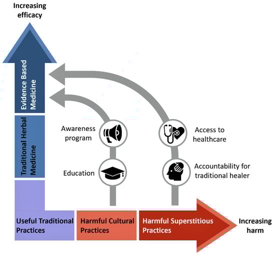 Simplified diagram showing the role of education, awareness, and availability of health care in the battle against harmful cultural and superstitious practices. “Kampo” is an excellent example of the useful practice of traditional medicine in Japan [72], while oral mutilation (“Ibyinyo”) is an example of harmful cultural practice [73]. The physical and emotional torture of mentally disabled individuals is an example of the harmful superstitious practice.