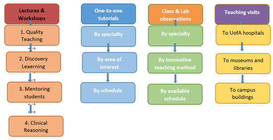 - Leslie, K.; Baker, L.; Egan-Lee, E.; Esdaile, M.; Reeves, S. Advancing faculty development in medical education: A systematic review. Acad. Med. 2013, 88, 1038–1045. [Google Scholar] [CrossRef] [PubMed]