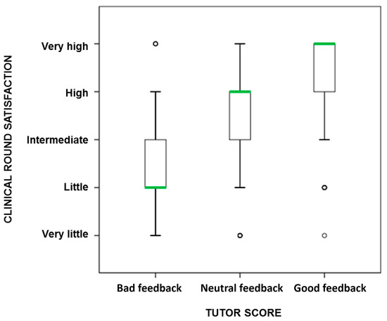 Satisfaction of clinical round plotted against tutor score. Shown is the average perceived student satisfaction of clinical round plotted for each of the tutor scores: bad feedback only, neutral feedback, and good feedback only.