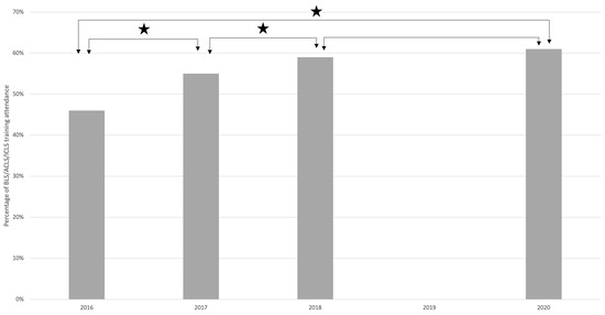Percentage of BLS/ACLS/ICLS training experience. This figure shows the rate of people who experienced the BLS/ACLS/ICLS training courses. The black star-shaped symbols represent significant increases in the percentage of trained people over time (a = 0.05). The p values for 2016–2017, 2017–2018, 2018–2020, and 2016–2020 are p < 0.001, p = 0.02, p = 0.15, and p < 0.001, respectively.