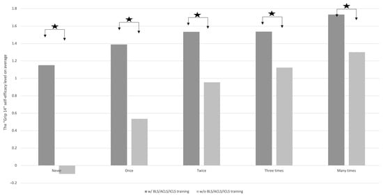 The “Grip 14” average self-efficacy levels by frequency of witnessing BLS/ACLS/ICLS-requiring emergency settings. This figure emphasizes the differences in the self-efficacy levels of the training attendants and the non-attendants after a certain frequency of witnessing emergency settings requiring BLS/ACLS/ICLS skills. The black star-shaped symbols represent significantly higher self-efficacy levels of training attendants (a = 0.05). All p values are <0.001.