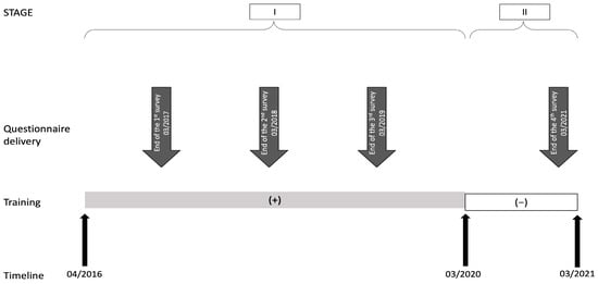 Timeline of the BLS/ACLS/ICLS training program and post-assessment. Scheme 1 shows the timeline of the BLS/ACLS/ICLS training program and the post-assessment from April 2016 to March 2021. It was divided into two main stages, with a gap in training during 2020. Stage I was marked by the introduction of the in-house training program in 2016, followed by a post-training survey in the same year until the routine training courses and their post-assessment occurred in 2017, 2018, and 2019, only skipping the post-assessment in 2019. Stage II included the delivery of survey questionnaires at the end of 2020 after skipping the training in 2020. In other words, the self-efficacy levels of the participants in 2016, 2017, 2018, and 2020 were scored as the post-assessment of the training in 2016, 2017, 2018, and 2019.