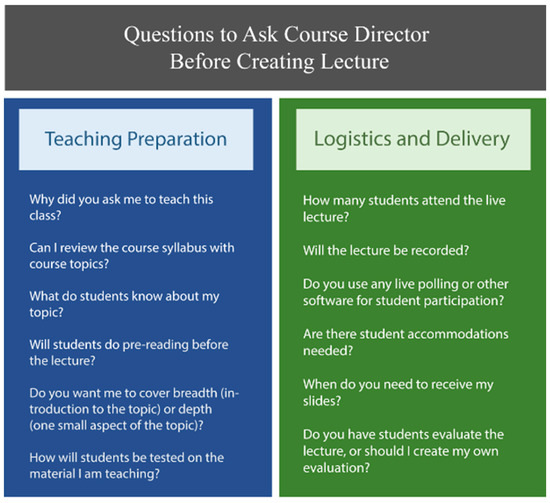 To achieve a shared understanding with the course director, ask questions about the course content, lecture style, and student experiences (Figure 1). Contemporary medical schools seek not only to foster student content knowledge but also seek to promote students’ ability to guide their own learning [4]. It undermines that message when lecturers in courses appear unaware of what has already been addressed and to what degree students are responsible for their own learning. Reviewing the course syllabus will help you gain a sense of the topics that have come before your lecture and topics that will follow your session. As the content expert, reviewing the syllabus will enhance your ability to make meaningful connections between your content and the course overall in ways in which the course director may not be able to do. Linking students’ prior experiences with the information you bring can also enhance student engagement and promote learning.