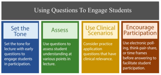 Placing questions early in the lecture will help set the tone and signal to students your expectation of their involvement throughout your time together. For example, a thought-provoking question (e.g., How might this recent medical development impact future patient care?) or an ice-breaking question (e.g., What has been the most challenging aspect of learning this course material so far?), indicates to students that you are open and value their interaction. Questions used in the middle or toward the end of the lecture can help students elaborate on ideas, connect new information with prior learning, combine ideas, or restructure knowledge when inconsistencies in their thinking are revealed [14].