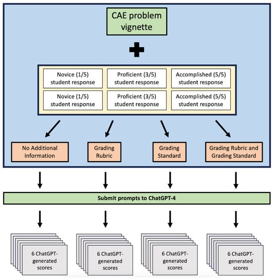 The study employed the most up-to-date version of ChatGPT at the time of the experiment (ChatGPT-4). For each CAE question, the set of six student responses was submitted to ChatGPT in July of 2023. The order of the six responses was randomized on each submission. A new session in ChatGPT was started for each of the four conditions to avoid any influence of previous evaluations on the scoring of the subsequent conditions.