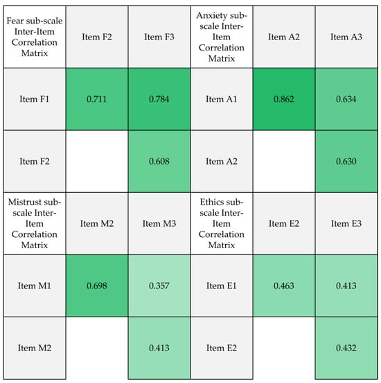 The Intraclass Correlation Coefficient (ICC) for the four FAME sub-scales’ items. Higher correlations are indicated by deeper shades of green.