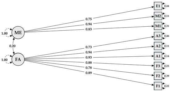 Path diagram of the two-factor confirmatory factor analysis (CFA) model. Fear and Anxiety (FA) and Mistrust and Ethics (ME). F: Fear; A: Anxiety; M: Mistrust; E: Ethics.