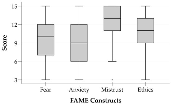 Whisker plots for the distribution of the four FAME (Fear, Anxiety, Mistrust, and Ethics) constructs scores.