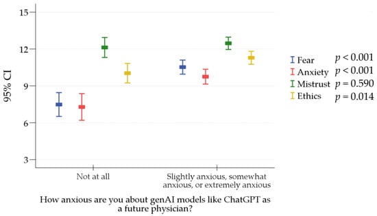 For the four FAME constructs, a higher level of agreement among the participants was seen for the Mistrust construct (mean: 12.35 ± 2.78), followed by the Ethics construct (mean: 10.86 ± 2.90) and Fear construct (mean: 9.49 ± 3.53), while the lowest level of agreement was seen for the Anxiety construct (mean: 8.91 ± 3.68, Figure 5). Statistically significant lower levels of agreement were seen among the participating medical students who were not anxious at all compared to those who showed any level of anxiety as future physicians towards genAI for three constructs, namely Fear, Anxiety, and Ethics (Figure 6).