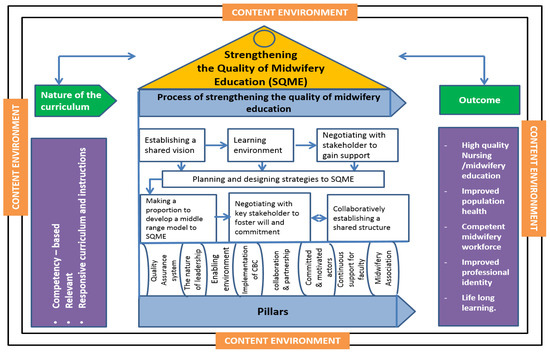 Concepts are described as intricate mental formulations of experiences that make up the entire phenomenon [37]. Concepts can be defined as either relatively associative (by how they are used within a theory) or relatively specific (by what they mean). In this middle-range model (Figure 2), concepts and sub-concepts were defined in a relatively associative manner. SQME is the core concept from which other concepts emerged. The emerging concepts in this article that support the core concept of ‘SQME’ are the (a) midwifery education context, (b) nature of the curriculum, (c) SQME process, (d) pillars, and (e) outcomes.
