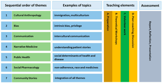 During the theoretical classes, students were taught about various relevant topics, which could be non-biomedical (themes 1 to 4) and biomedical (themes 5 and 6) topics. In the final theme, students had to integrate everything they had learnt throughout the course by examining a topic of choice more elaborately. Students first received theoretical courses (workshops, discussions) or practical training (e.g., communication). Second, students were given exercises intended for practice and reflection during their volunteer work. Last, each theme concluded with students submitting their thematic assignments and a reflective discussion. During the reflective discussion, students shared their learning experiences related to the topic.