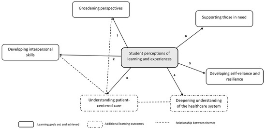 Based on the various reflections on students’ learning goals prior to and post completion of the CEL internship, several unique themes emerged (Figure 2). Students began their internship with learning goals broadly fitting into four themes. At the end of the course, students indicated that most of these initial learning goals were partially or completely achieved. Additionally, two new learning goals were identified: understanding patient-centred care and deepening understanding of the healthcare system. These latter two themes were not initially identified as learning objectives before the course commenced but were acknowledged by students following course completion as aspects that students had picked up throughout the course and which they intended to carry forward into their future careers.