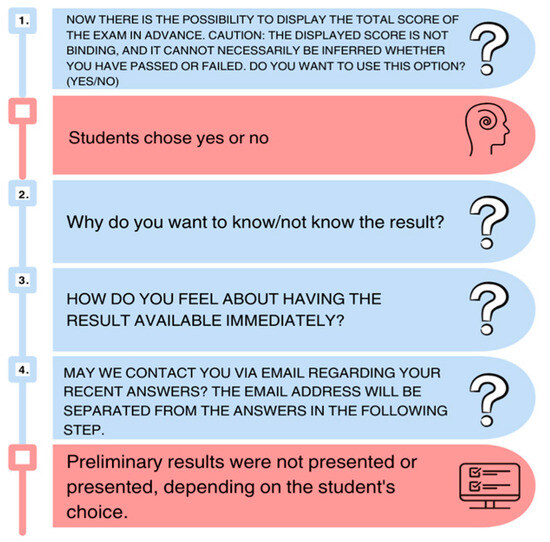 The exams consisted of 60 constructively aligned MCQs and included an additional research component after the main exam. In the first study arm (WS 22/23), the research section allowed students to see preliminary SF in the form of scores immediately after completing the exam. This was the first time this option had been offered to these students. As can be seen in Figure 1, they were asked about their reasons and their feelings regarding this option.
